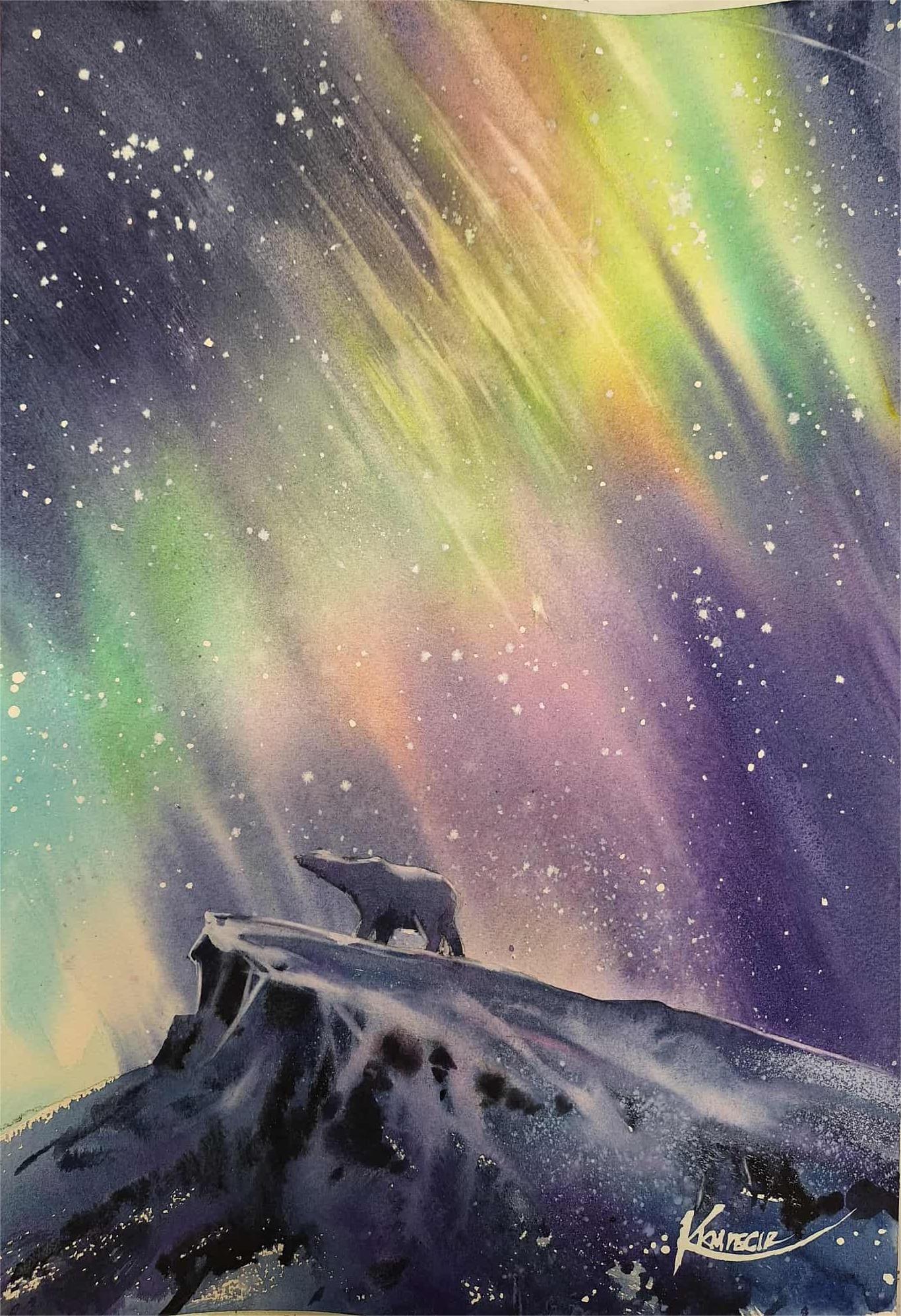 I dette nettkurset lærer du trinn for trinn å male to vakre nordlysmotiver – ett med isbjørn og ett med nordlys som speiler seg i vannet.