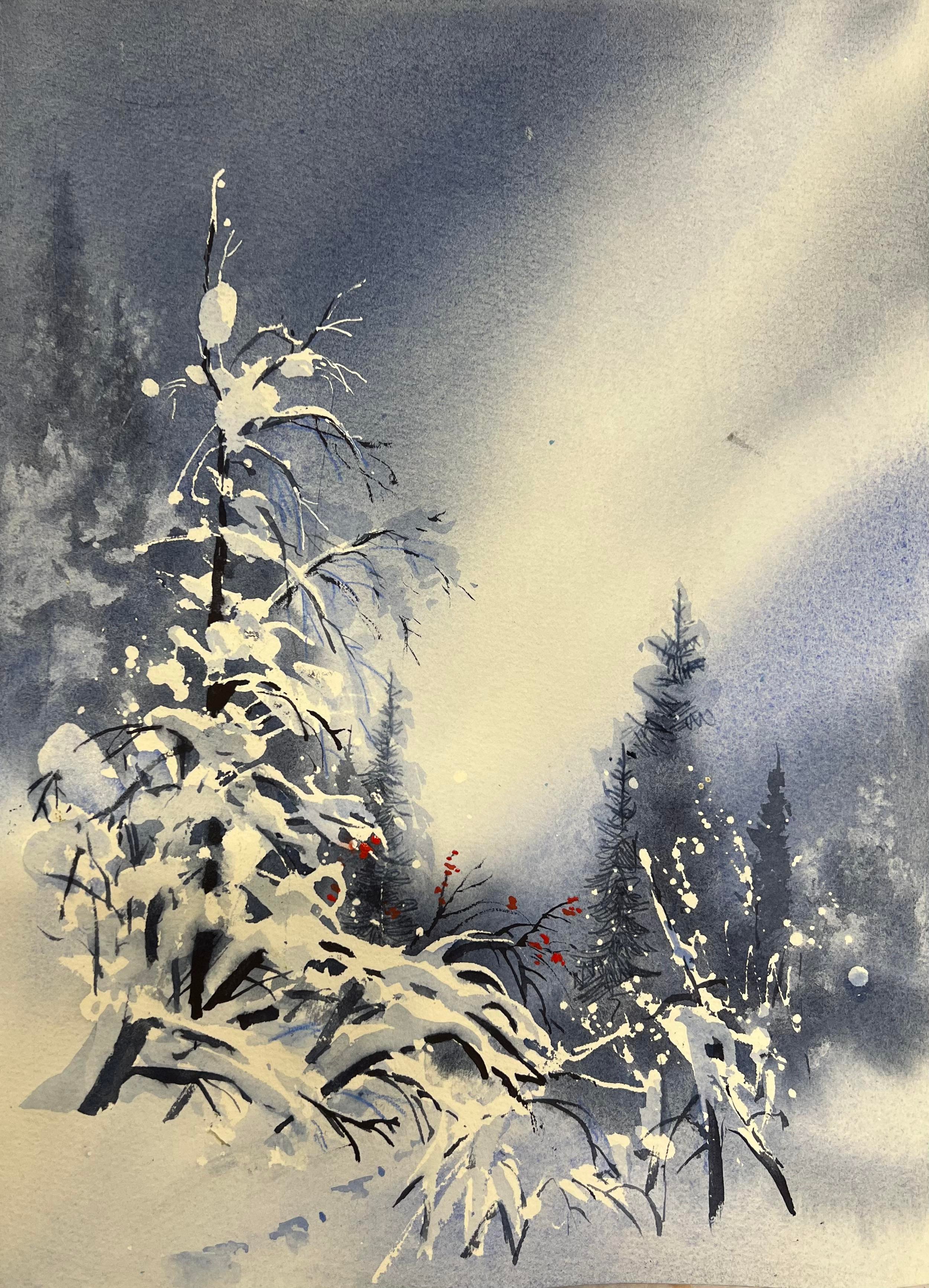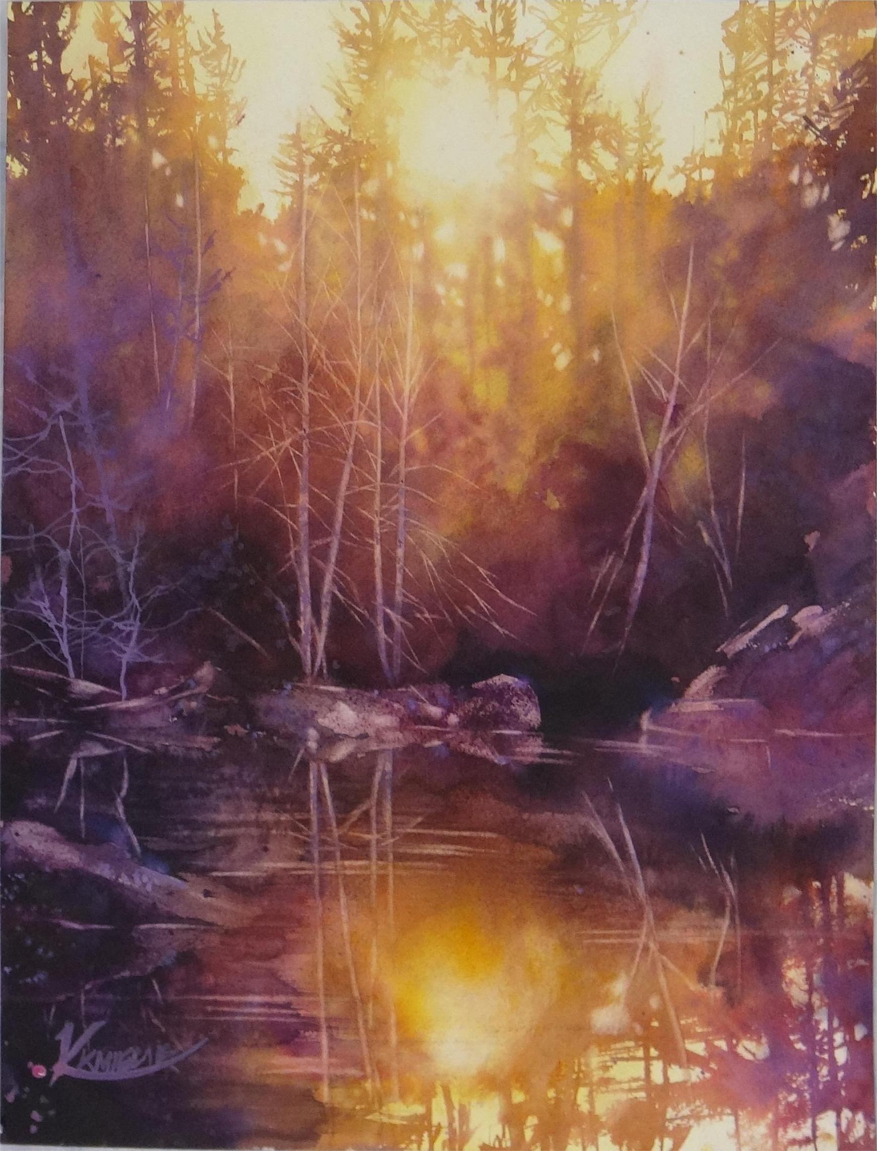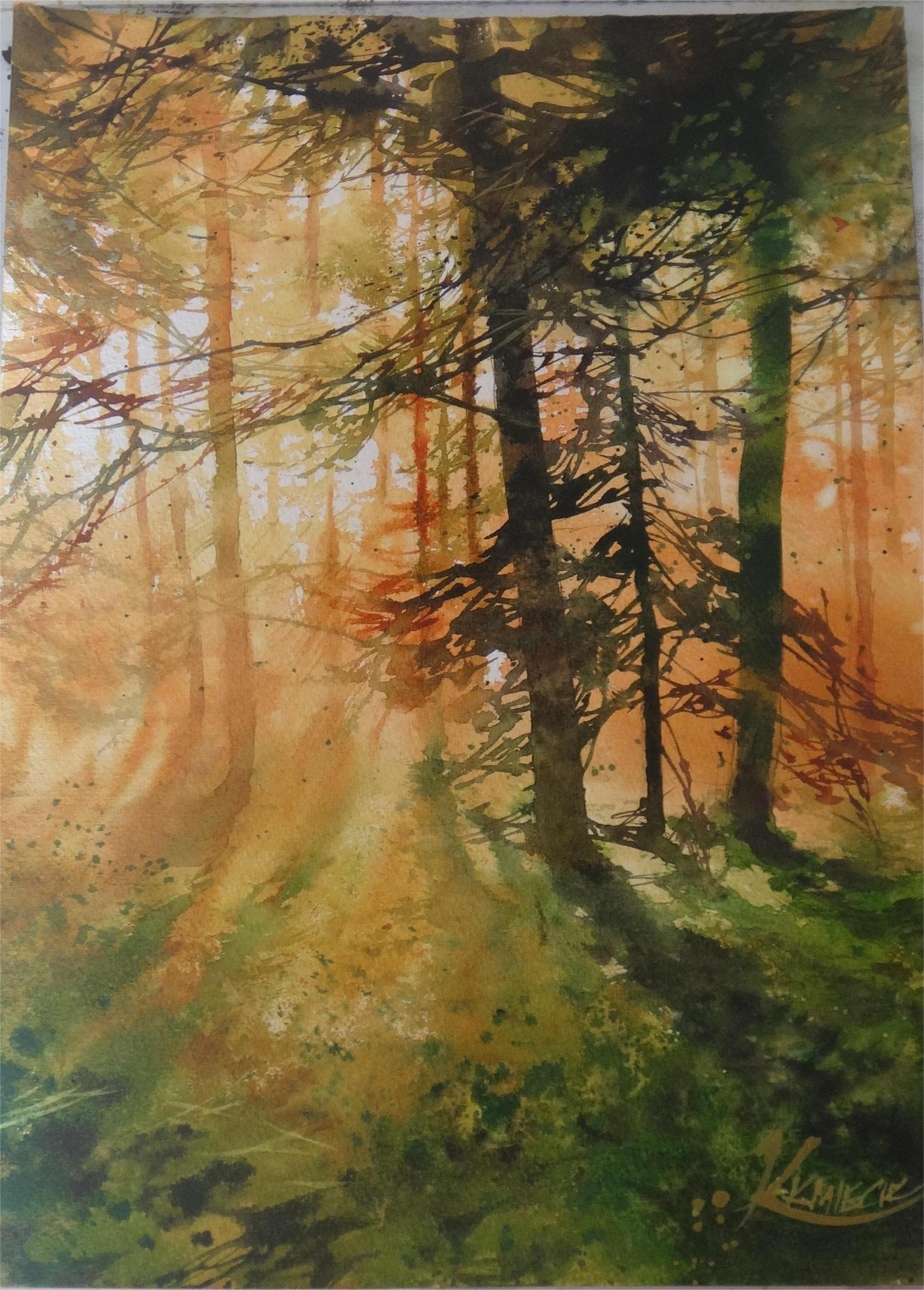 Bli med på innsiden og lær å mal skog i motlys med Katarzyna Kmiecik. Dere får sett hvert strøk hun tar på begge disse flotte akvarellene Pluss dere får flotte øvelser det er lurt å gjøre før du starter på selve maleriet.