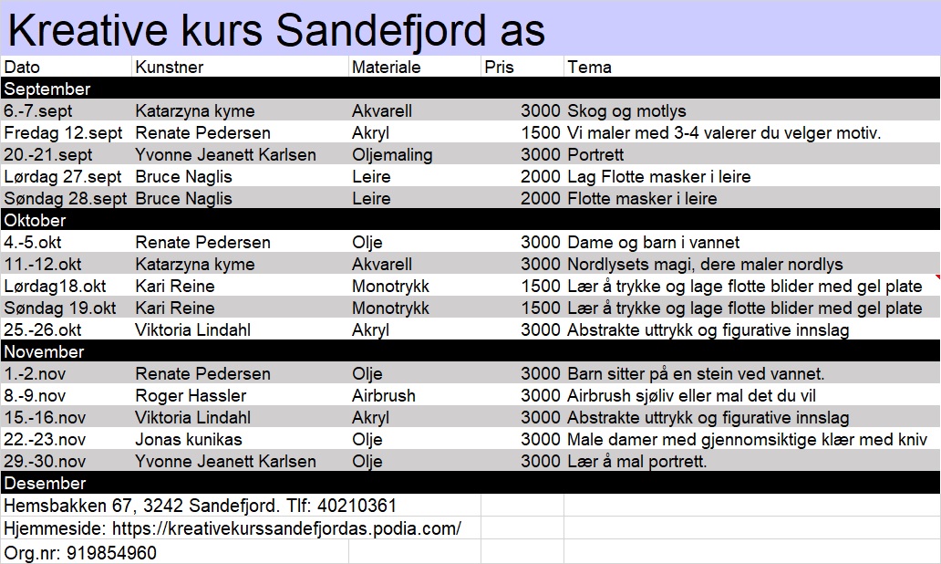 Påmeldig og mer informasjon om kursene er på facebook siden til Kreative Kurs Sandefjord as.